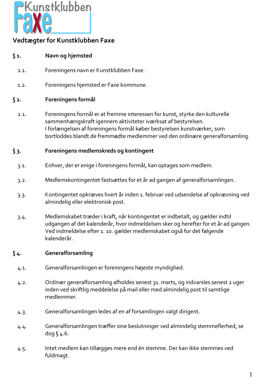 Kunstklubben Faxes første vedtægter blev vedtaget ved den stiftende generalforsamling den 19. juni 2013.