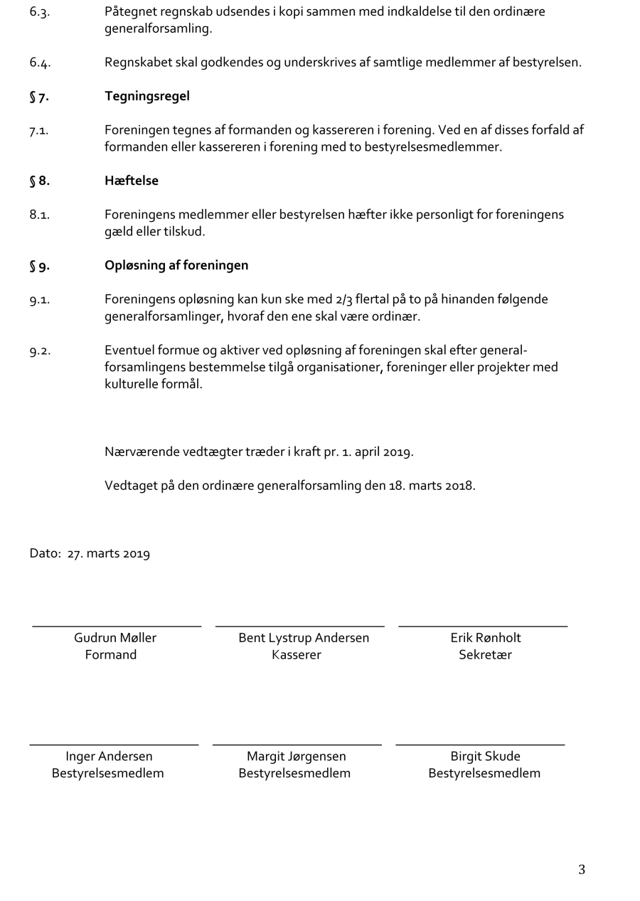 Nedenstående reviderede vedtægter blev vedtaget på den ordinære generalforsamling den 18. marts 2019.